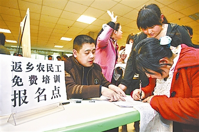 2月14日上午,四川省遂宁市在人才市场举行春季大中专毕业生和返乡农民工大型招聘会,吸引了160余家用工单位免费入场招聘人才。遂宁市总工会困难职工帮扶中心在招聘会上组织返乡民工免费培训,为他们尽快实现再就业提供帮助。钟敏 摄