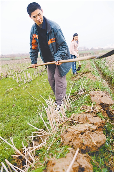 2月17日,袁松松(前)、黄群花夫妇在地里开沟整田。