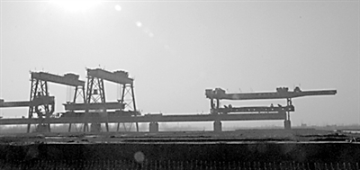 2月10日,中国铁建十五局集团磨盘张制梁场日产4孔长32米的900吨箱梁,创开工以来最新纪录。磨盘张制梁场是京沪高速铁路上最大的制梁场,将为京沪高铁建设提供900吨箱梁1091孔。图为月光下员工们正在架梁的情景。孙进修 丛建伟 摄