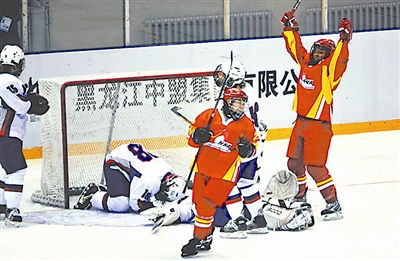 中国子女冰球队以5:3战胜斯洛伐克队。图为中国队队员庆祝进球。 本报记者 许之丰 摄