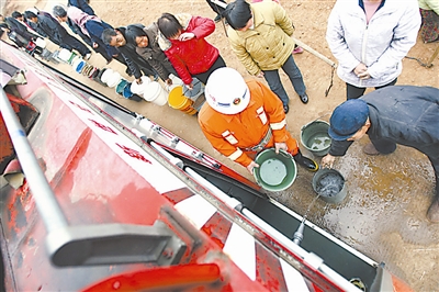2月18日上午,河南省洛阳市伊川县吕店乡苏沟村迎来了为他们送水的消防官兵,吕店乡苏沟村由于旱情严重,村里惟一一口机井慢慢干涸,致使全村140户600余人面临饮水困难。村民们每天到3公里外的邻村拉水救急。伊川县公安消防大队在走访中了解到该村的情况后,决定为全村的村民送水,解决燃眉之急。