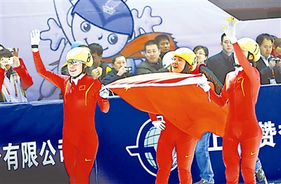 世界大学生冬季运动会首日短道速滑女子1500米比赛中国选手包揽前三名。图为获胜后的中国队员高举国旗向观众致意。本报记者 许之丰 摄