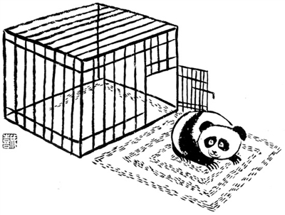 王成喜是一位多产的漫画家,画过不少好作品,他落笔简练兼得墨趣,有自己的风格。在这里介绍他的一幅熊猫出笼的无题漫画。熊猫关在笼中太久了,有机会走出笼外却不会奔跑而去,还是像在笼中那样兜圈子。题材不大,应是小品幽默,但读画后除得一笑外,还能引发人们一连串的联想。熊猫之踱方步是一种长期被关禁闭的习惯,或叫习惯势力,这是一种可悲的后遗症。