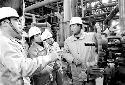 2月17日的作业间隙,中石油锦州石化公司添加剂车间运行三班班长曹利新(右一)又忙着组织骨干研究磺酸盐装置钙化系统的优化操作。入春以来,曹利新已带领大伙儿成功处理了管线腐蚀泄漏等5起事故隐患,多次受到上级嘉奖。初尝甜头的曹利新告诉笔者,班长是班组安全生产第一责任人,要搞好安全管理就必须根治隐患。张一峰 摄