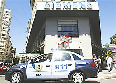 2月19日,在阿根廷首都布宜诺斯艾利斯,一辆警车停在西门子公司办公楼外。当日,阿根廷警方对西门子公司办公室进行搜查,以调查其在上世纪90年代阿根廷梅内姆政府期间的行贿行为。根据法官指控,西门子公司当年为了从梅内姆政府获得居民身份证电子化项目工程,向阿政府高官行贿。