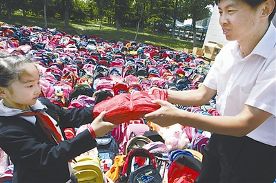北京海淀区将区内各所学校为灾区孩子捐赠的书包和红领巾装车运往灾区。 董一鸣 摄
