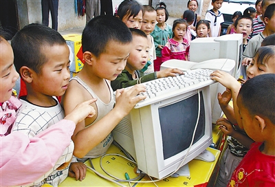 共青团西安市委、西安市希望办以及陕西天惠科技企业(集团)公司向地处西安市临潼山区穆柯寨乡穆柯寨小学的学生们赠送了价值近3万元的十台电脑和建网配套设施,帮助这些山中孩子筹建西安市第一所希望网校。孩子们摸着电脑,久久不愿离去。 袁景智 摄