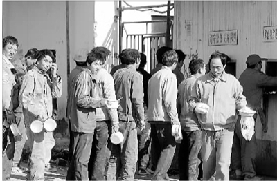 在北京的一个建筑工地上,农民工们正排队打饭。很多人表示非常希望自己有一天也能有养老保险。 本报记者 杨登峰 摄