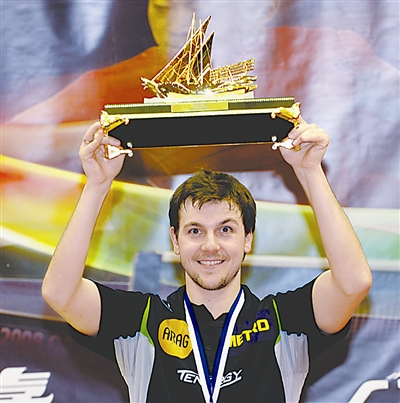 2月21日,在多哈举行的卡塔尔乒乓球公开赛男单决赛中,德国选手波尔以4比3战胜中国选手马琳,获得冠军。图为波尔在颁奖仪式上。新华社发 陈少金 摄
