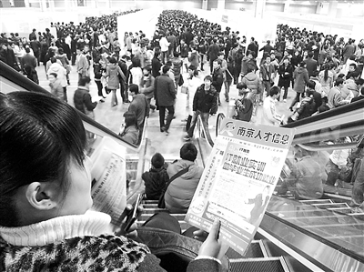 2月21日,在南京市举办的“新春大型综合性人才招聘会”上,一大学生在寻找适合自己的就业信息。南京市日前出台了《关于促进高校毕业生就业工作的若干意见》,力求通过多种渠道扶持大学生就业,把因经济下滑给毕业生就业带来的影响降到最低点。谷昌旺 摄