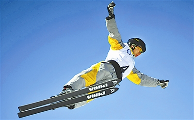 2月23日,大冬会亚布力赛区再次传来喜讯:在自由式滑雪男子空中技巧的比赛中,中国选手获全部奖牌。图为获得金牌的贾宗洋在比赛中。