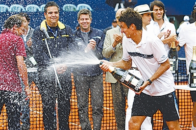 2月22日,在阿根廷首都布宜诺斯艾利斯举行的阿根廷网球公开赛男单决赛中,西班牙选手罗布雷多以2比1击败本土作战的阿根廷选手胡安·摩纳哥,夺得冠军。图为罗布雷多喷洒香槟庆祝胜利。新华社发(塞尔吉奥·亚梅拉 摄)