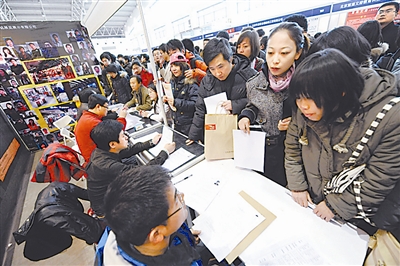 2月5日上午,北京市首届人才招聘会在北京农展馆举行,数万人当天前来应聘。一家展览公司引起许多应聘者的兴趣,招聘台前挤得水泄不通。本报记者 张宪 摄