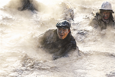 拍摄当天,导演一声令下,吴刚已率先跳入泥浆池,边用力用双手搅动泥浆,边兴奋地操着甘肃方言大吼:“搅拌性能不错,我说管用就管用,再下来几个有种的!”这场王进喜带头跳进泥浆池,用身体充当搅拌机搅拌泥浆压制高压井喷的戏份看上去有些悲壮。随后几个年轻演员也纷纷跳下池中,更多的泥浆随着同伴的扑腾不断溅到吴刚的脸上、脖子里,甚至嘴里。为了制造特殊的效果,剧组的鼓风机一旁强力作业,一时间石灰粉弥漫,呛得人睁不开眼。再抬头,已然往复拍摄了5条,导演尹力一声“过”!吴刚终于停下来,在几个工作人员的搀扶下从泥浆池中颤巍巍地爬上来。