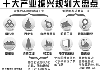 对于10个重点产业调整和振兴规划的选定,刘铁男说: 目前,纺织和轻工的食品、造纸、家具、家电、皮革、日化等部分行业吸纳进城务工者近6000万人。钢铁、石化、有色金属作为重要的基础原材料工业,船舶和装备制造作为重要的基础装备工业,在国家经济安全、国防安全等方面发挥了不可替代的支撑作用。高速发展的电子信息产业使我国社会信息化水平实现了质的飞跃。物流业是融合运输业、仓储业、货代业和信息业等的复合型服务产业,是国民经济的重要组成部分,涉及领域广、吸纳就业人数多、拉动消费作用大,其增加值占全部服务业增加值的16.5%,占GDP的6.6%。我国是一个有13亿人口的发展中大国,工业化、城镇化和国际化面临的发展和建设任务艰巨,无论是过去、现在,还是可预见的将来,这些行业的地位和作用不会改变。房地产行业落选的原因之一是各地已经出台了许多措施,并开始显现效果。