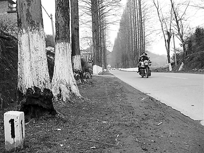 浙江省开化县高坑坞、十里铺、翁村等路段,有30多棵行道树被人为损坏,这些被损毁的行道树包括水杉、榆树等树种,树龄都在20年以上,根径约30厘米左右,有20多米高。这些行道树靠近根部的地方不是被人用火烧得面目全非,就是被人用刀砍成伤痕累累。专家称,树木被砍烧成这样,树液不能循环流动,可导致死亡。浙江省 徐曙光 余水坤 摄