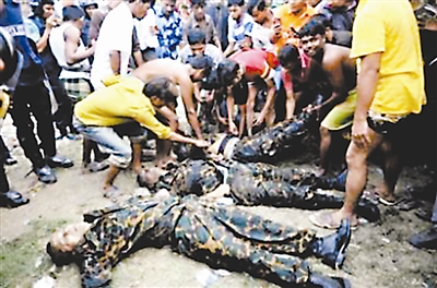 孟加拉国政府26日表示,发动叛乱的步枪队已开始放下武器陆续返回军营。图为当天在首都达卡,市民们正在围观几具步枪队士兵的尸体。吉平 供图