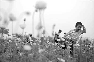 2月28日,一名小朋友在广州番禺百万葵园的花海里拍照留念。