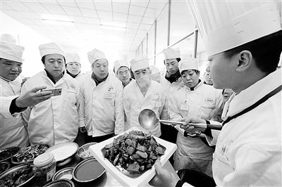 2月28日上午,30名在北京新东方烹饪学校学习的特困职工在老师的指导下做出了香喷喷的菜肴,他们中成绩合格者将获得《国家职业资格证书》。本次培训班是北京市职工帮扶中心为使特困职工掌握一门职业技术、增大就业机会而举办的,每个学员3000多元的学费全部由北京市帮扶中心负担。本报记者 张宪 摄