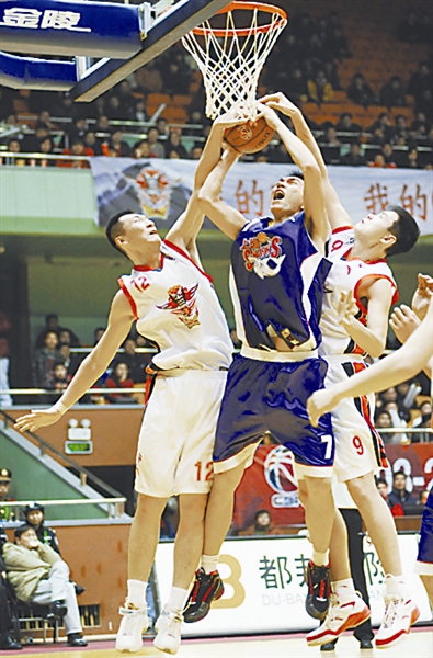3月1日,山东黄金球员郭磊(左)、曹振华(右)封盖上海西洋球员彭飞(中)的上篮。当日,在2008-2009赛季CBA联赛第42轮比赛中,山东黄金队主场以103比101战胜上海西洋队。 新华社记者 范长国 摄