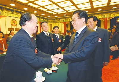 胡锦涛看望出席全国政协十一届二次会议民盟、民进界委员并参加联组讨论。 新华社发