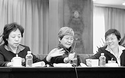 3月4日上午,全国政协十一届二次会议各界别进入小组讨论。在妇联界别,樊锦诗委员(图中)刚刚就有关保护甘肃月牙泉景区发表完看法后,坐在两侧的王淑玲(图左)和谢京委员几乎同时去拿话筒准备补充发言。本报记者 杨登峰 摄
