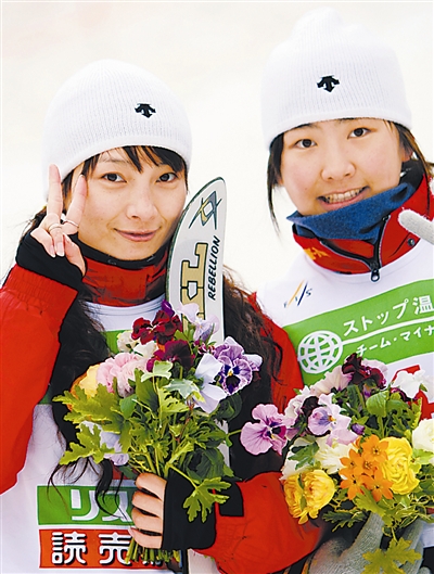 3月4日,中国队选手李妮娜(左)和徐梦桃在赛后庆祝。当日,李妮娜和徐梦桃在日本福岛县猪苗代町举行的自由式滑雪世锦赛女子空中技巧的决赛中,分获冠、亚军。