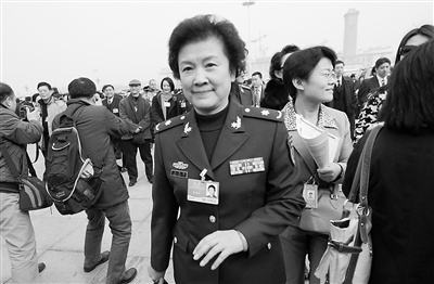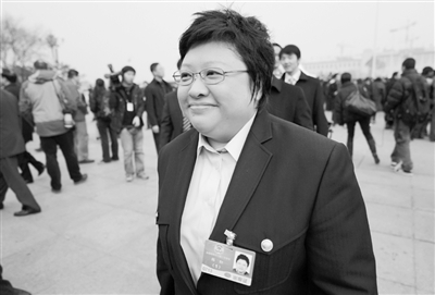 ②全国政协委员、歌唱家宋祖英委员进入人民大会堂时接受记者的采访。