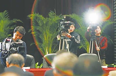 3月6日上午,在工会界讨论会上,三架摄像机同时对准了发言的委员。自两会开始,每天工会界的讨论都会吸引众多记者前来采访。本报记者 杨登峰 摄