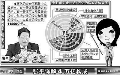 对于在两会上对“4万亿”投资结构进行调整的原因,张平解释说,这是在听取了专家、地方和部门以及社会舆论等方方面面的意见后,调整了去年的初步方案,形成了现在这个新的结构。