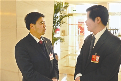 3月5日,农民工代表康厚明(左)利用会议中间休息时间,找到郑功成委员,交流农民工面临的劳动保障问题。 本报记者 王四新 摄