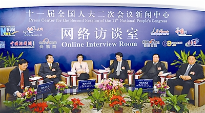 来自重庆、广东、北京、广西、辽宁等地的几位全国人大代表来到十一届全国人大二次会议新闻中心网络访谈室,与网民在线交流。 新华社记者 杨宗友 摄