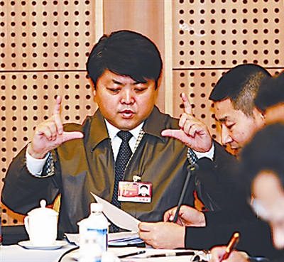 3月5日,参加全国政协社会福利和社会保障界小组讨论的全国政协委员于兵用手语发言。 新华社记者 鞠鹏 摄