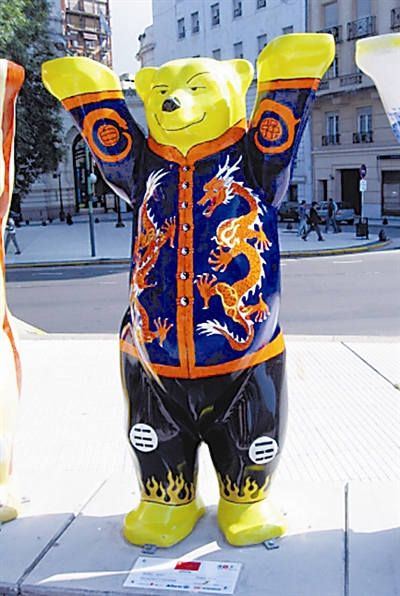 140多座高约2米的经过艺术彩绘的“巴迪熊”雕像在布宜诺斯艾利斯市中心著名的圣马丁广场上围成了一个方圆500平方米左右的圆圈。每只“熊”身上都绘有其所象征国家独具民族特色的图案。代表中国的“熊宝宝”身着带有龙图案的唐装,手臂上写着“自”“强”两个汉字,憨态可掬。而象征美国的“巴迪熊”,则被制作成自由女神的姿态。