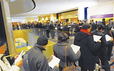 3月5日,在美国纽约曼哈顿时报广场的万豪侯爵酒店,求职者排队等候进入招聘会现场。当日,美国一招聘网在纽约启动2009美国城市招聘会,90多家公司参加,吸引了3700多名求职者前来应聘。新华社记者 谷欣容 摄