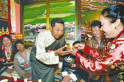 3月8日下午,是参加两会代表和委员的休息时间,部分委员来到北京民族文化宫参观“西藏民主改革50年大型展览”(图一),一张张生动的图片反映了西藏50年的沧桑巨变。在藏族民俗展区,好客的主人为来自西藏的代表献上酥油茶(图二),并送上美好祝福。