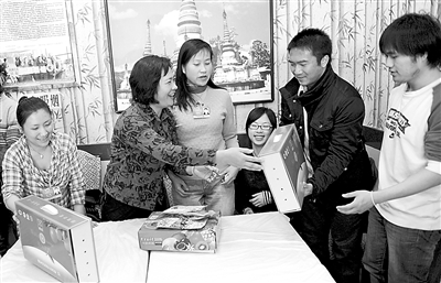3月8日,是十一届全国人大二次会议的休息日,来自云南代表团的管国芳代表(傣族)(左三)、孙春兰代表(阿昌族)(左二)、杨艳代表(德昂族)(左一)利用休息日来到中央民族大学,看望在这里就读的边远地区的孩子们,希望他们努力学习回报家乡。