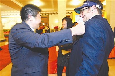 3月3日,华旗资讯集团总裁冯军委员偶遇老朋友外国记者白克龙。两人寒暄后,白克龙问冯军的企业在金融危机下怎么样了,冯军开玩笑说:“我们比你想象得要坚强。”冯军今年的提案是《建立海外孵化器帮助国内企业“走出去”》,他认为民族品牌应该走出去,并希望政府在帮助中小企业走出去方面有更大作为。本报记者 杨登峰 摄