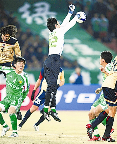 3月10日,北京国安队门将杨智(中)门前救险。当日,在2009年亚冠联赛小组赛E组比赛中,北京国安队主场迎战澳大利亚纽卡斯尔喷气机队。北京国安队以2比0战胜对手。 新华社记者 郭勇 摄