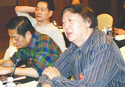 3月9日,全国政协委员、中国文联副主席冯骥才(右)提出,越是在金融危机的背景下,越应该重视文化建设,考虑社会的全面发展。国家需要有立体的文化结构来展现当代文化精神,提出文化战略有利于聚拢当代文化精英,弘扬当代文化经典。 新华社记者 任沁沁 摄