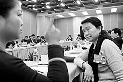 3月7日,在政协社会福利和社会保障界小组讨论会上,高晓笛委员通过翻译罗红的手语翻译,了解其他委员的发言情况(上图、中图)。当“听到”委员们热心支持残疾人社会保障方面的发言后,她禁不住流下热泪(下图)。