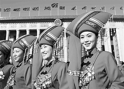 为两会服务的女工作人员在人民大会堂前留影。新华社记者 刘卫兵 摄