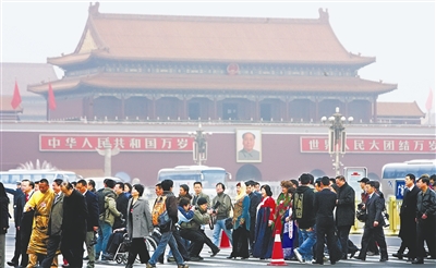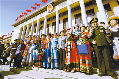 3月13日上午9时,第十一届全国人民代表大会第二次会议在北京人民大会堂闭幕,这是部分少数民族代表在人民大会堂东门外合影留念。 本报记者 许之丰 摄