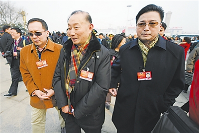 今年两会就如何振兴民族文化问题,代表、委员们均给予了极大的关注。全国政协委员著名京剧演员梅葆玖(中)委员提出了一系列建设性建议。 本报记者 许之丰 摄