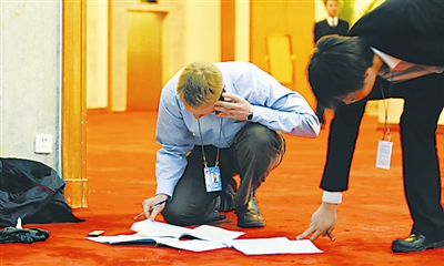 3月10日上午,在人民大会堂一楼新闻发布厅举行记者会,由工业和信息化部部长李毅中、人力资源和社会保障部部长尹蔚民、商务部部长陈德铭就扩内需、促就业、保增长等问题回答记者提问。因为发布会涉及到工资问题、就业问题、物价问题等等直接与百姓息息相关,吸引了大批的中外记者。这位英国BBC台记者在发布会前一小时到达,将发布会第一手材料摊在地毯上,准备提问和报道的选题。 本报记者 许之丰 摄