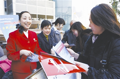 3月14日,上海航空的工作人员吴尔愉(左一)在向市民介绍上海航空的便民服务。当日,一场“3·15”便民咨询服务活动在上海南京东路举行,58家涉及民生的沪上企事业单位和市民现场受理消费者的投诉。新华社记者 裴鑫 摄