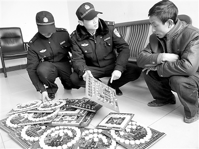 武汉市东西湖区警方针对群众反映强烈的赌博机问题开展集中围剿,今年以来,已查处各类赌博机窝点50多处,查获赌博机百余台,处罚违规经营人员50多人(次),净化了社会环境。图为今年3月6日武汉市东西湖区公安分局巡警大队缴获的赌博机电路板并对违规经营人员进行法制教育的情形。