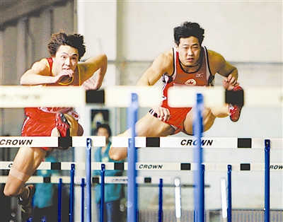 3月15日,解放军选手纪伟(右)在2009年全国室内田径锦标赛(北京站)男子60米栏决赛中,以7秒78的成绩夺得冠军。 新华社记者 廖宇杰 摄