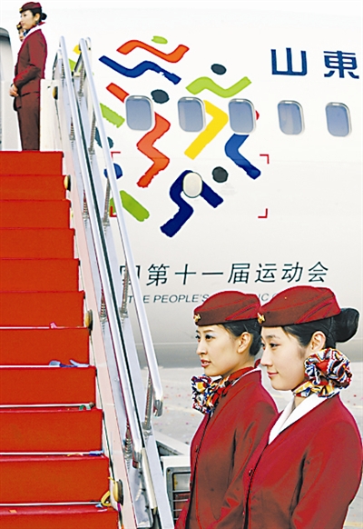 3月13日,由山东航空公司为第十一届全国运动会定制的“全运号”飞机在山东济南亮相。“全运号”飞机将主飞北京、上海、广州、南京等曾经举办过全运会的城市航线,除执行正常航班之外,还将执行指定航线任务,加大对全运会的推介力度。新华社记者 朱峥 摄