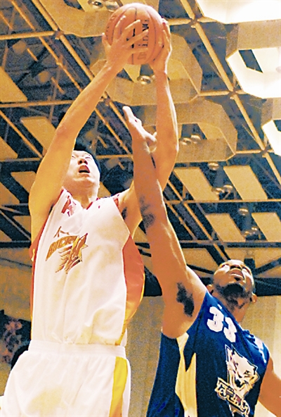 3月15日,在2008—2009赛季CBA联赛第48轮的比赛中,东莞马可波罗队客场以106比103战胜八一双鹿队。 图为八一球员王治郅(左)在比赛中上篮。 新华社记者 黄深钢 摄